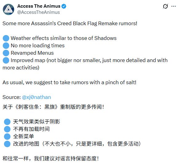 YouTube內容創作者j0nathan(經X賬號Access The Animus轉譯)透露,重製版或採用《刺客信條:影》同款動態天氣系統。據稱遊戲菜單全面重構,地圖細節提升——雖未擴大規模,但活動內容更豐富,與此前新增任務傳聞相符。