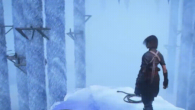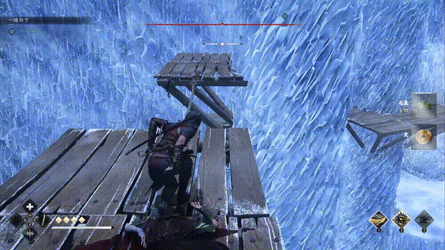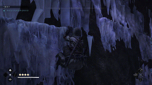 一段过场动画之后,我们就进入了任务场景,跟随指引跑图即可。墙上的冰挂可以攀爬,总体来说有点《古墓丽影》那味儿,场景做得还是不错的。