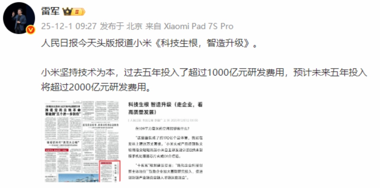 小米集团创始人雷军12月1日宣布,《人民日报》头版报道了小米《科技生根,智造升级》一文。雷军表示,小米坚持技术为本,过去五年投入了超过1000亿元研发费用,预计未来五年投入将超过2000亿元研发费用。