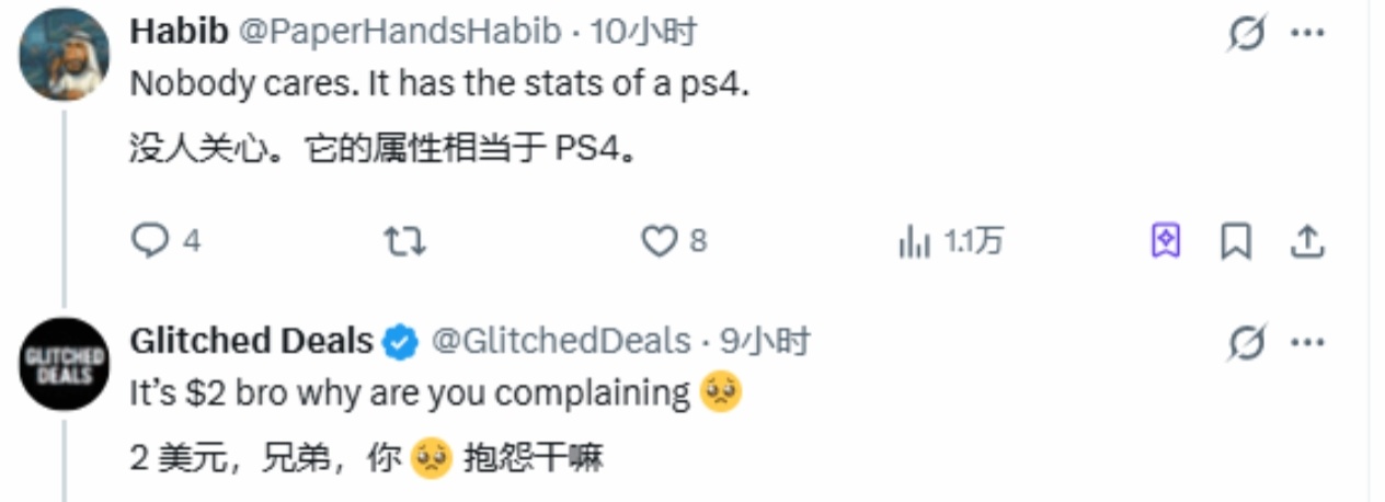 面对各种讨论,@GlitchedDeals轻松回应:“才2美元兄弟,抱怨什么呢?” 这一超低价交易为关注价格错误的网友们提供了谈资。