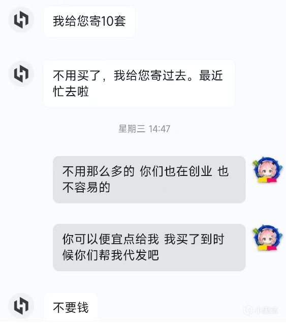 后面提出给我送10套感谢我的分享,我觉得他在创业初期也不容易,提出自行购买几套送粉丝,但是商家太热情了,最后不好意思要的5套