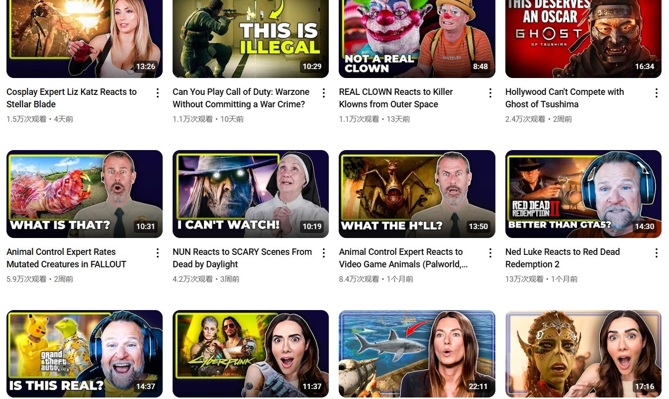 除了BuzzFeed Multiplayer与Gamology,REACT频道也出过一些专家游玩视频,该频道于5年前发布的专业驱魔人玩《鬼泣5》视频在youtube上有86万的播放量,而他们于9年前发布的老年人玩《GTA5》视频在youtube上的播放量则高达3382万。