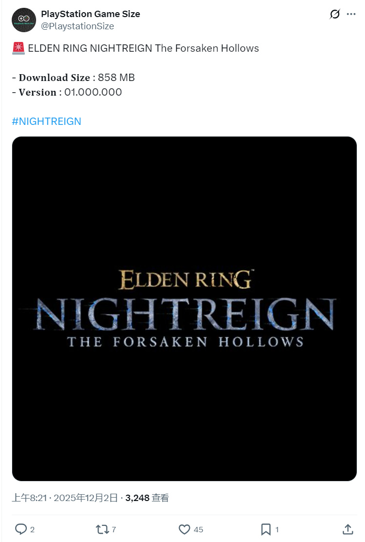 据数据挖掘者PlaystationSize消息称,《艾尔登法环:黑夜君临》追加DLC“见弃空洞者”下载大小为858MB,版本号为01.000.000。