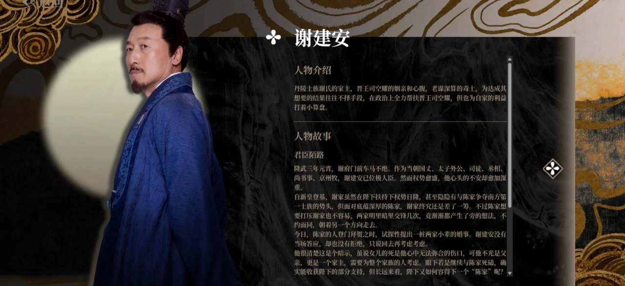 谢建安和男主关系非常紧密,女儿是男主的王妃,儿子是男主手下的大将军,不仅如此,在男主兵权被夺,北伐无法继续,自己也危在旦夕的这种困难的时候,谢建安甚至主动北方前去帮助男主,谢家上下对男主都是忠心耿耿。