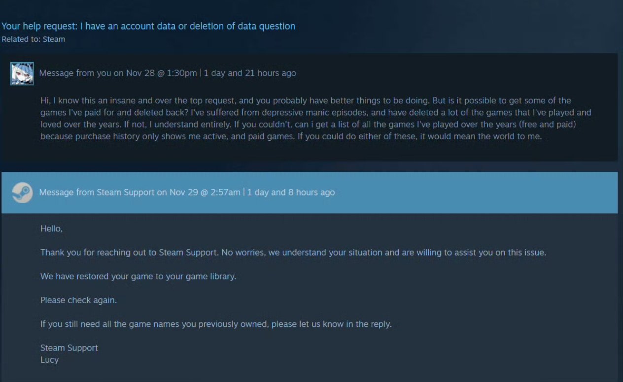 他向Steam客服求助,坦诚说明了自身健康状况,并请求恢复游戏或至少获取一份游戏列表。Steam客服人员Lucy的回应简洁而温暖,她表示“不用担心,我们理解你的情况,并会协助解决这个问题”,随后迅速将该玩家的游戏恢复到其游戏库中。此举获得了该玩家由衷的感谢,并在网络上引发了广泛好评,许多网友认为Steam客服的理解和解决问题的态度在当前游戏公司服务中显得尤为难得。