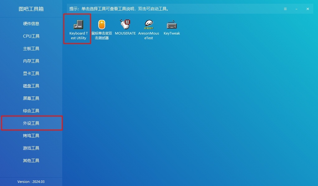 装好轴体之后,先不要急着装键帽,而是打开图吧工具箱,找到外设工具栏目的Keyboard test键盘按键测试工具,把所有的轴体都按一遍,看看能不能触发。