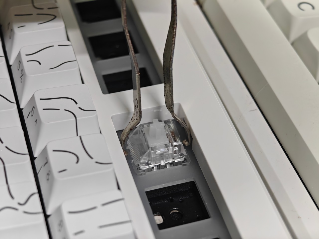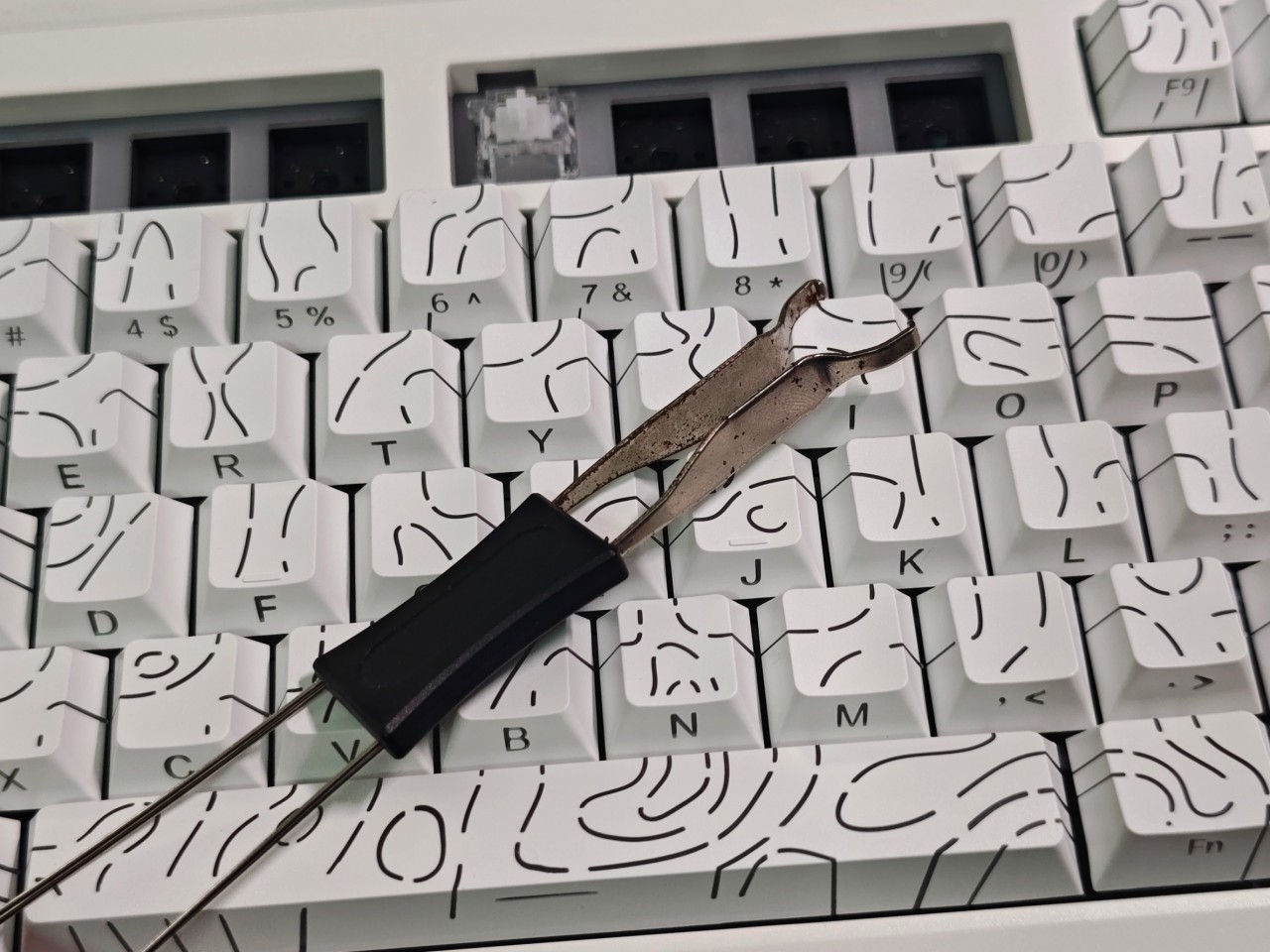 当你把所有的键帽拔下来之后。就可以拔轴了,正常来说是这样,但我前面已经把键帽和轴体一起拔下来了。
