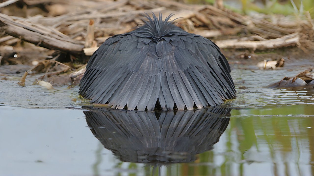 黑鹭把头埋入阴影中,便能不受水面反光的干扰。就像戴了潜水镜一样,能够清晰洞察水下的情况,进而实现精准定位。