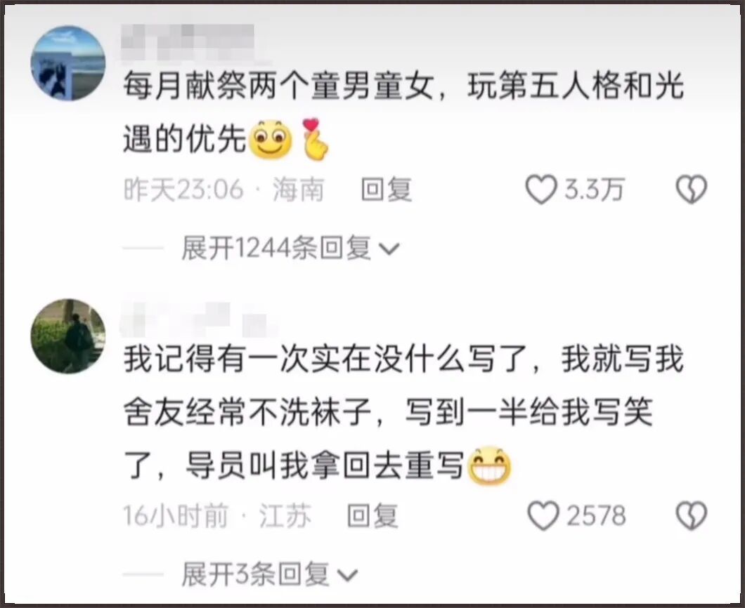 底下还有一些刻板印象的调侃段子,像什么“每月抓两个童男童女献祭”,还有什么“玩《第五人格》的、看Vtuber的优先”之类……看着还挺乐子的。