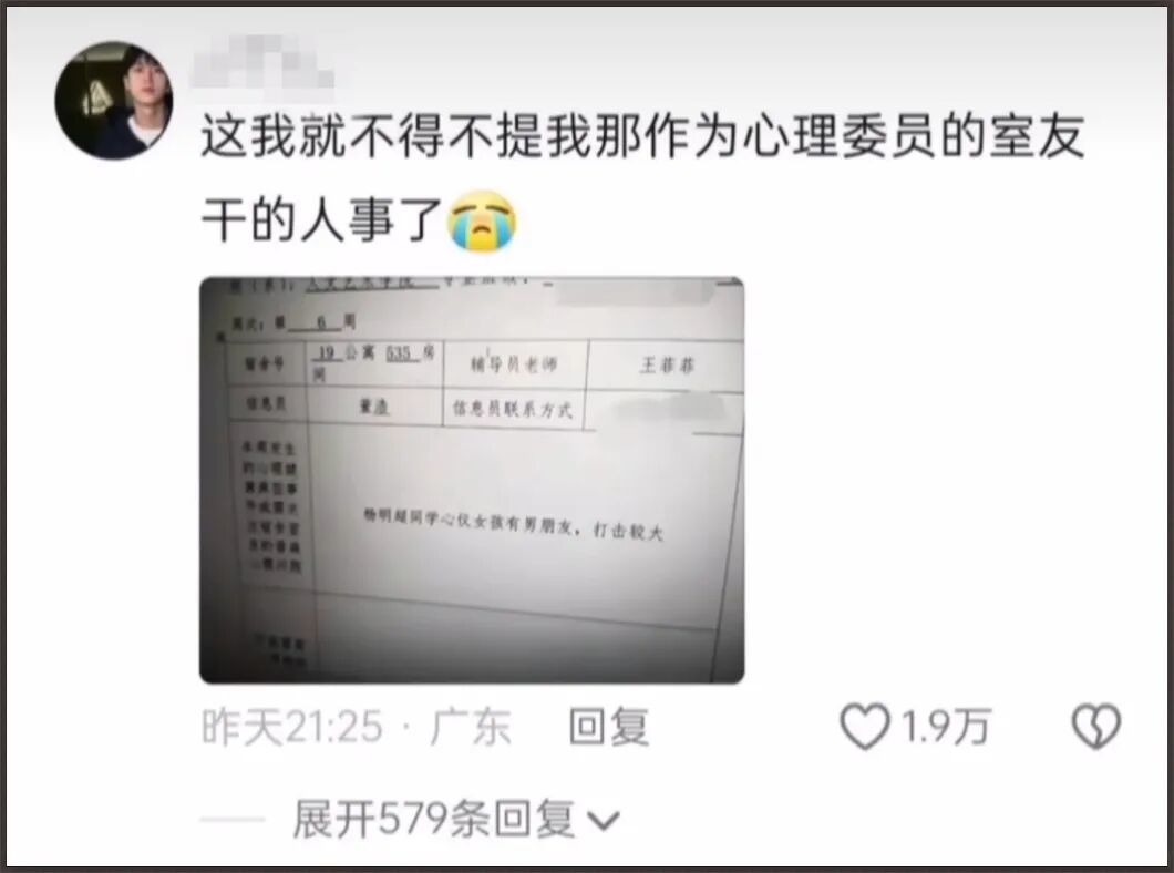 “你咋了?有啥事给我说,我是心理委员。”“你最近怎么了?我是心理委员,你可以和我说说。”——表面上看似想了解情况并提供疏导,实际上只是想吃瓜围观热闹。
