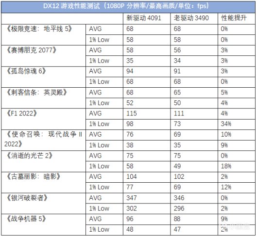 DX12遊戲的提升相對來說就沒有那麼明顯了,參與測試的大部分遊戲在使用4091驅動時平均幀保持原狀或小幅提升,只有《使命召喚:現代戰爭II 2022》和《戰爭機器5》的平均幀提升相對較爲明顯,畢竟作爲一塊基於DX12設計的顯卡,在DX12遊戲中的表現從一開始來看就是比較正常。而1% Low幀則或多或少有一些提升,新驅動的整體優化體驗還是有提升的。