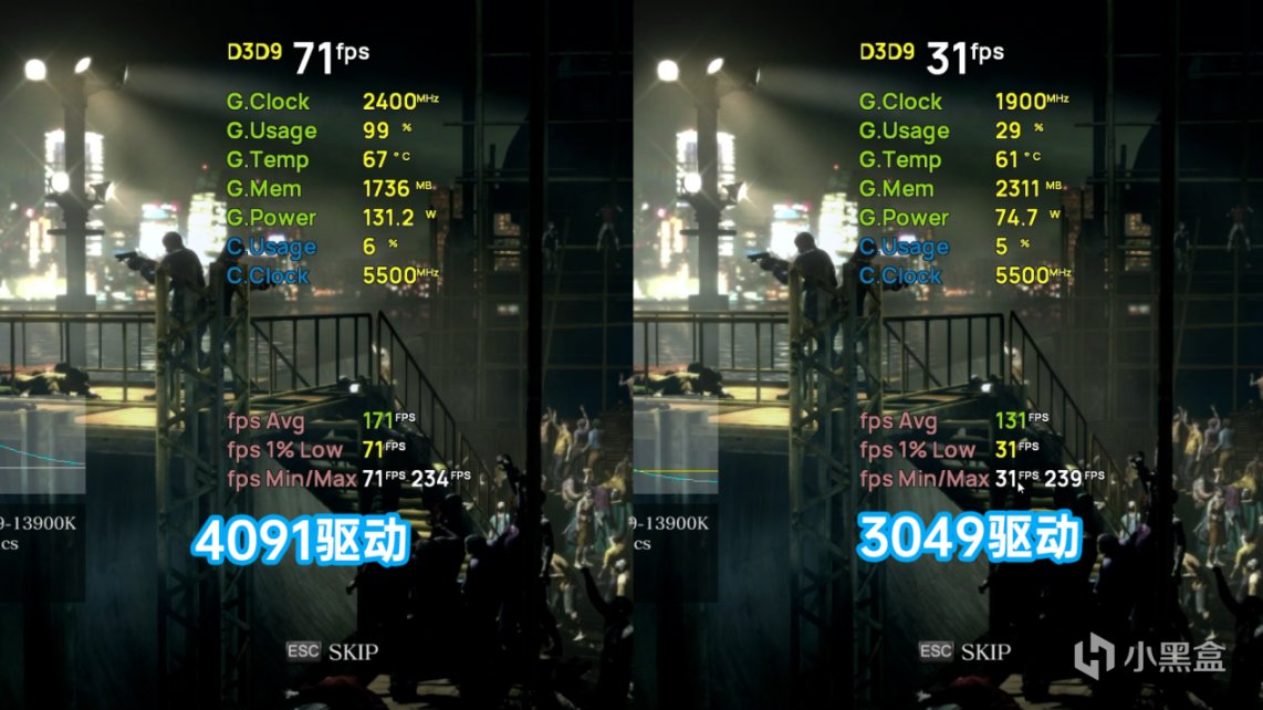 ●作爲一款10年前發佈的遊戲,《PAYDAY2》至今還在更新,依舊有着上萬的日活躍玩家。4091驅動提升同樣非常大,1% Low幀的表現都應接近了3049驅動的平均幀。