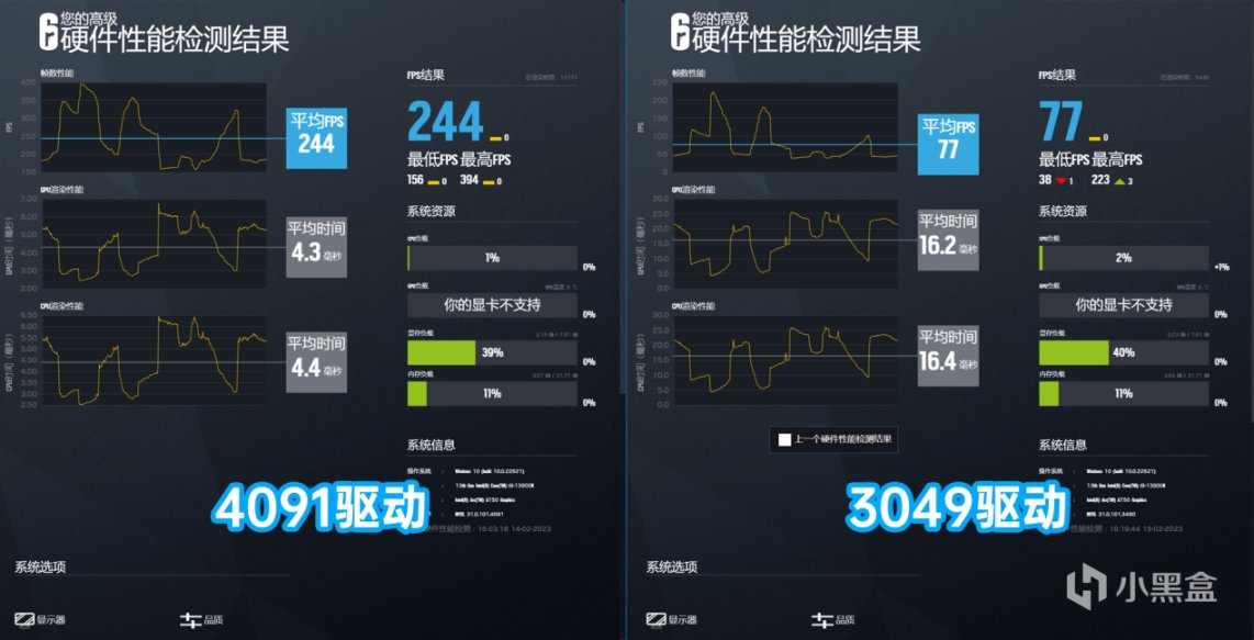 從測試畫面來看,使用3049驅動時,在射擊動作和經過水麪畫面時有明顯的幀速下降和卡頓出現,從而導致整體的幀速降低。4091驅動應該是修復這些BUG,所以帶來了性能上的大幅提升。從遊戲Benchmark給出的檢測結果來看,3049驅動的GPU平均渲染時間達到了16.2ms,而4091驅動則只有4.3ms,提升也是非常明顯的,4091驅動確實有更好的優化。