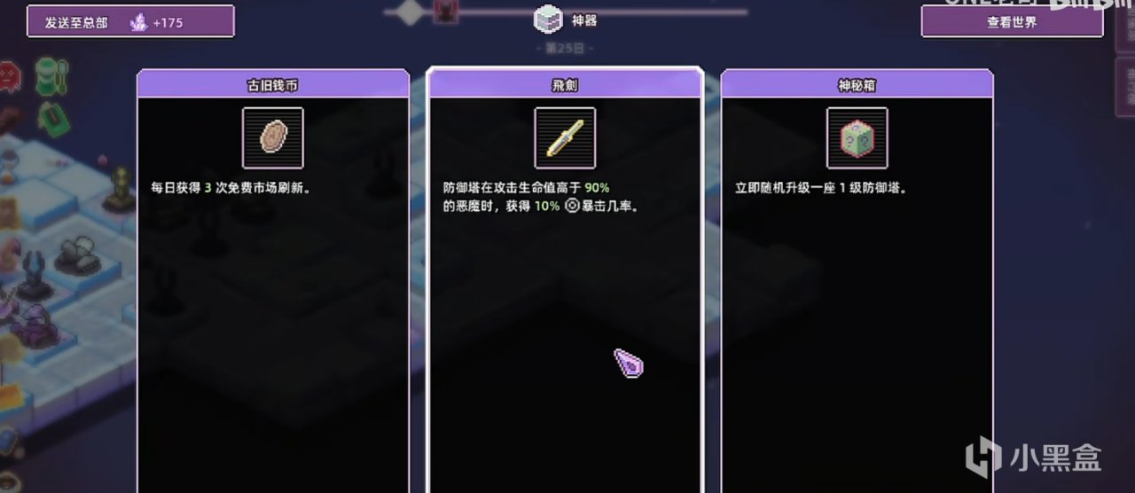 但只要你稍微玩過幾把便會發現,絕大多數的加強升級都是隔靴搔癢、浮於表面。真正起作用的只有幾個特殊的選項。比如神器中可以讓防禦塔,每晚通過擊殺怪物最多加30攻擊力的嗜血儀式。或者購買強化時,有百分之25幾率額外獲得一個複製的,有絲分裂。尤其是在最高難度中,你拿不到這幾個特殊加成,預示着你本局大概率GG。