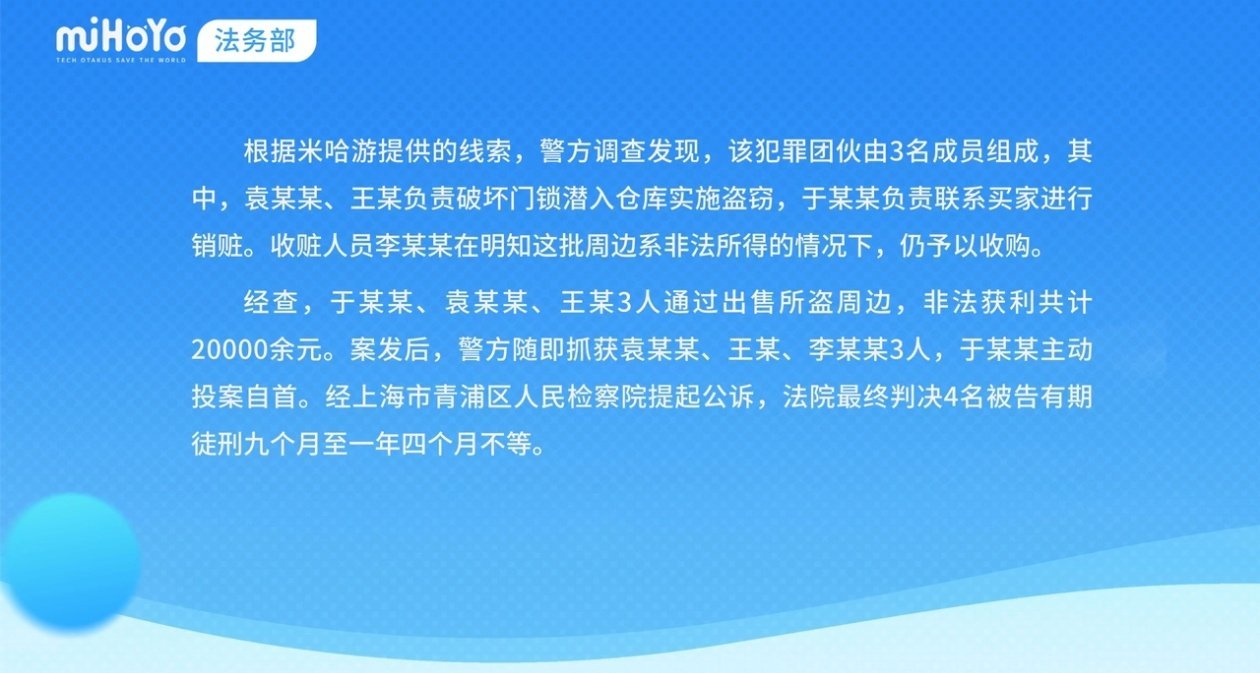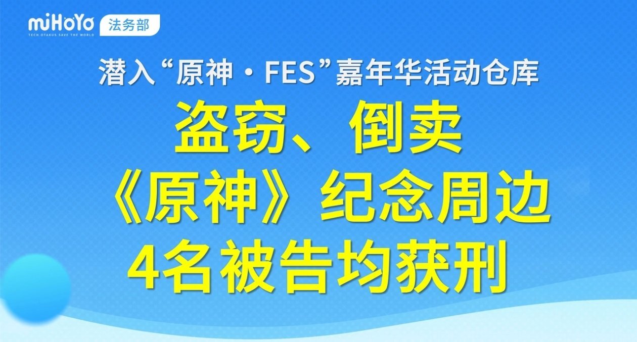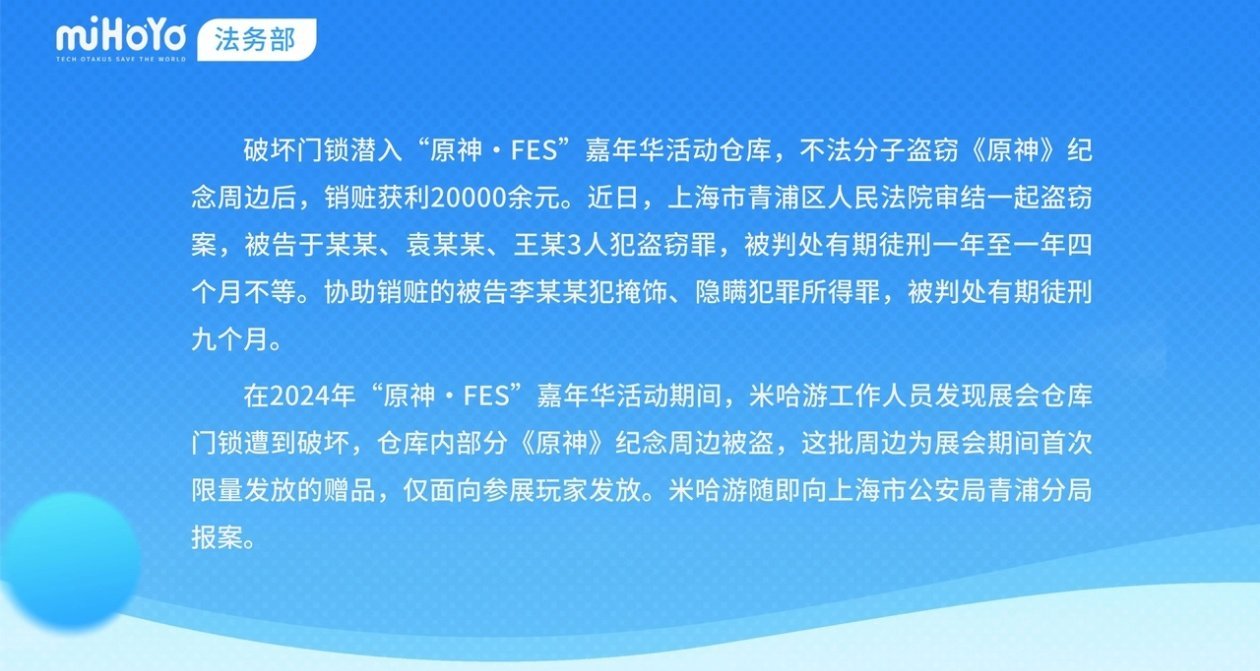 2025年12月2日,米哈游法务部发布公告:2024年“原神·FES”嘉年华活动期间,4名不法分子潜入活动仓库盗窃《原神》纪念周边并倒卖获利,已被上海市青浦区人民法院依法判刑。