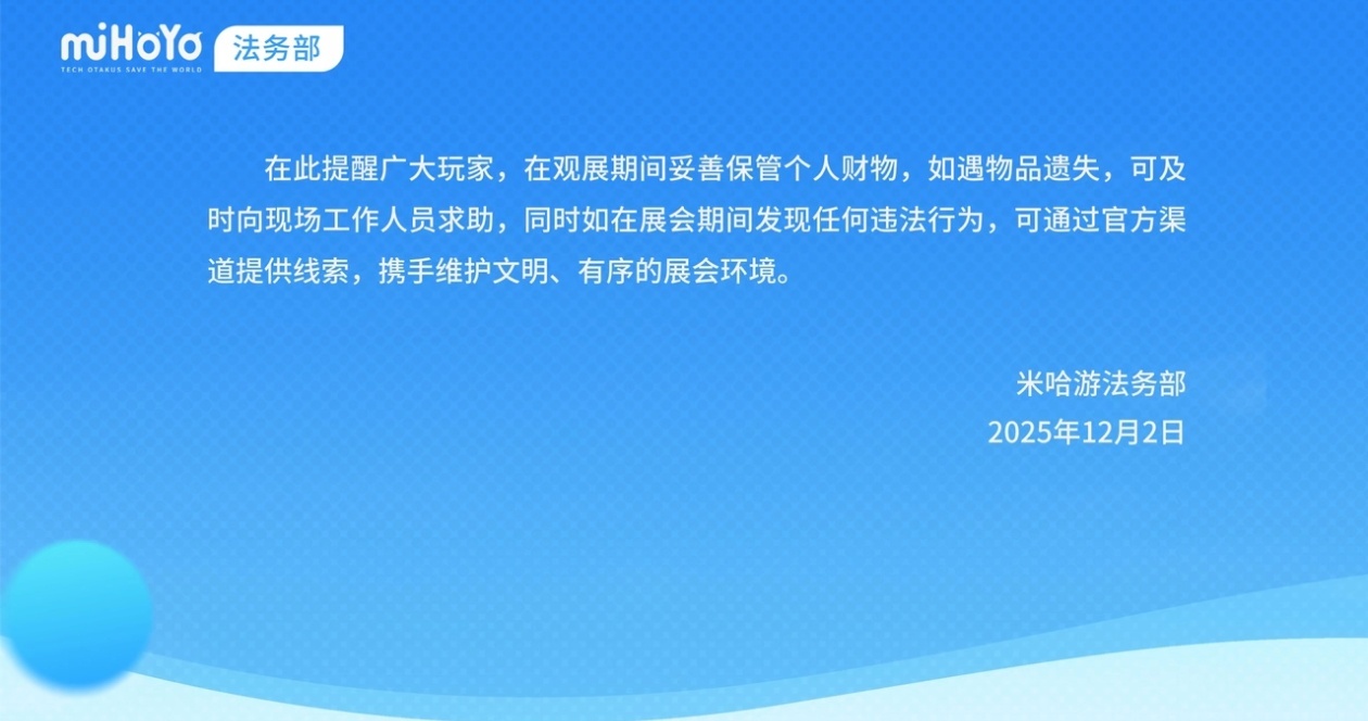 米哈游法务部同时提醒玩家,观展期间应妥善保管财物,遇遗失或违法行为可及时联系现场工作人员或通过官方渠道提供线索,共同维护展会秩序。