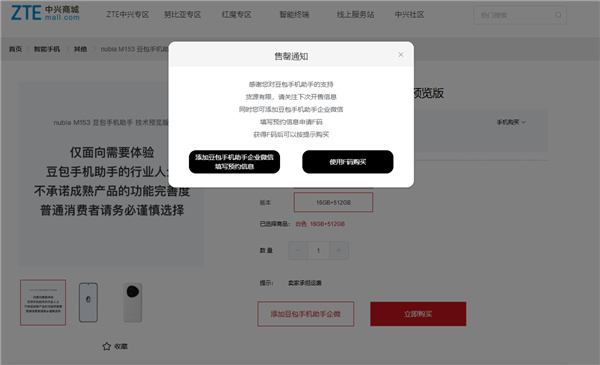 目前中兴商城显示,努比亚M153已为“售罄”状态,官方提醒,货源有限,请关注下次开售信息。