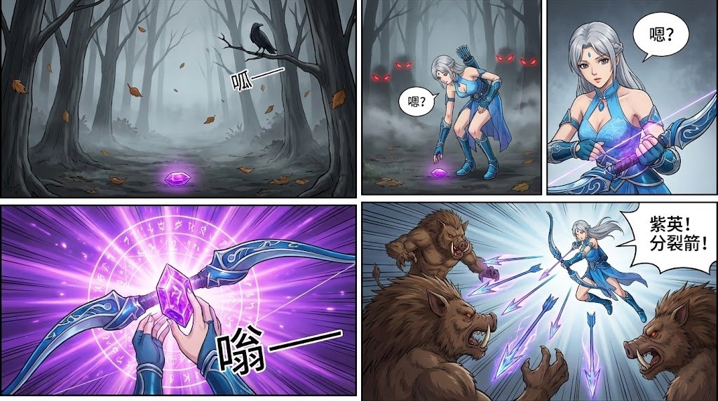 分鏡 3:半身近景,弓箭手將寶石鑲嵌到弓箭上,寶石爆發出強光,光線向外擴散,畫面大部分被紫光和魔法紋路佔據,配中文擬聲詞「嗡——」。 分鏡 4:中近景,3只怪獸跳出攻擊弓箭手,弓箭手往後跳的同時向三隻怪獸發射箭矢,弓箭手旁邊有一個對白:「紫英!分裂箭!」。頁面整體佈局清晰,有漫畫分格邊框,構圖適合一張 16:9 橫向漫畫頁