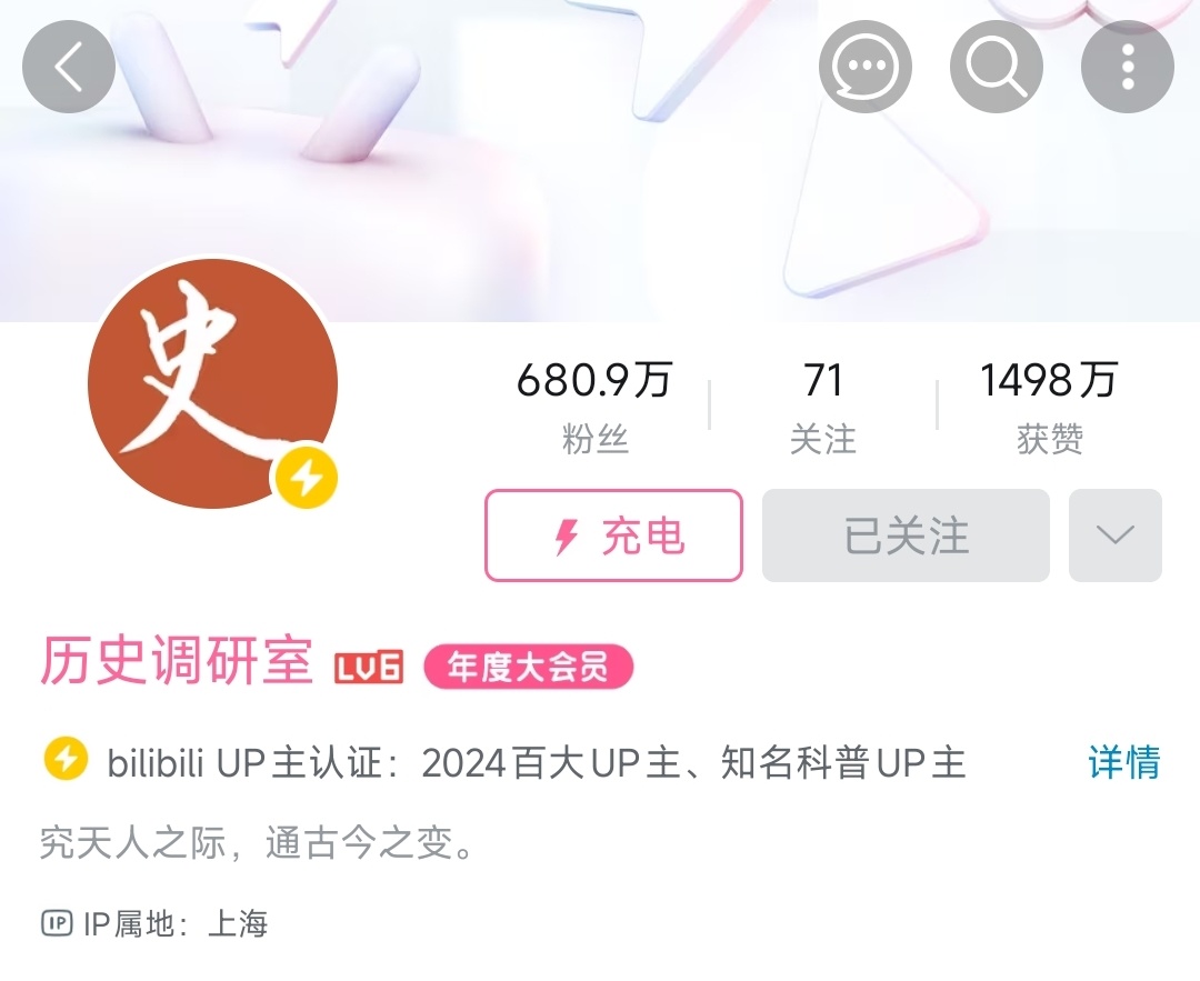 历史区真神,在B站历史区这个很多半吊子的地方几乎可以说是做到了最专业,不仅资料充实而且逻辑清晰,缺点是有的视频要充电,还有大部分视频都在30分钟以上,推荐比较闲的时候看。