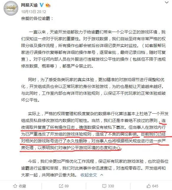 【事情后续】BUG出现的第六天才被修复,但此时游戏内的御魂系统已经崩溃。然而面对这一局面官方非但没有反思自己,反而是在游戏内通过通告倒打一耙,声称玩家是发现BUG以后为了私欲有意压制了消息不肯反馈,而把自己塑造成了一个得知问题以后立刻就解决的敬业团队。并且宣布不仅要开始封禁玩家,欢迎玩家互相举报,还要对在社交媒体上质疑游戏团队的玩家进行诉讼。结果这一波把留存的平民玩家也得罪了,大量平民玩家也出走退坑以后,官方意识到问题严重性,滑跪道歉。但此时游戏的人气流失已经非常严重,直接导致游戏从几乎做到了现象级退热到泯然众人矣。