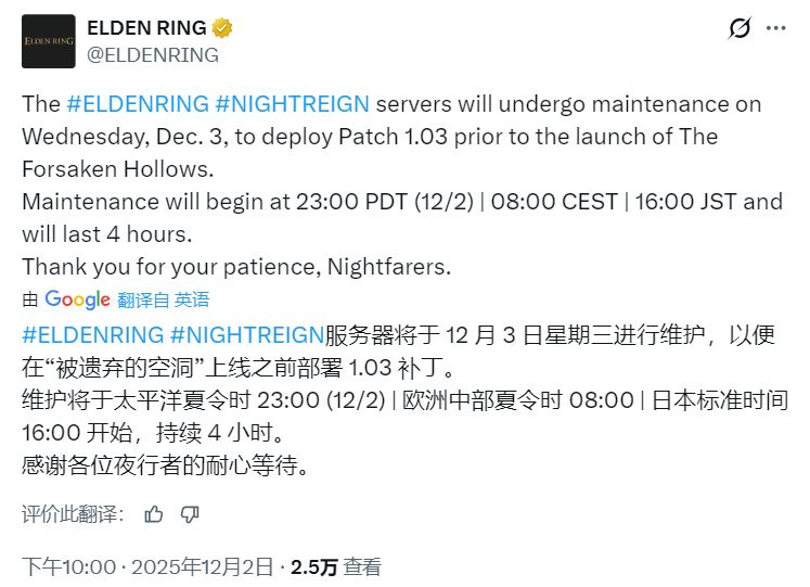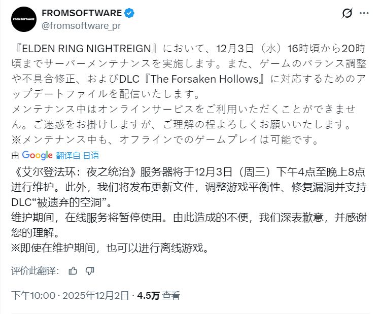 From Software宣佈,《艾爾登法環:黑夜君臨》將於北京時間12月3日下午3點至晚上7點進行停服維護更新。
