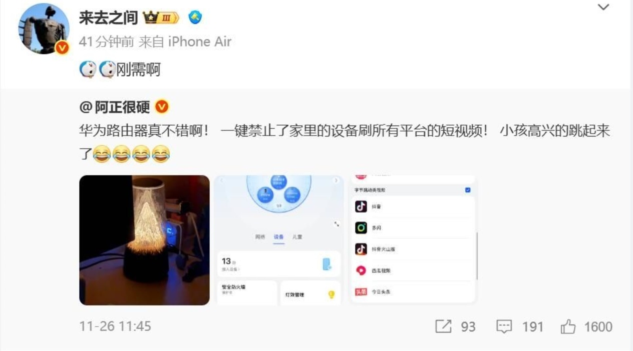 近日有博主分享使用华为路由X3 Pro日照金山版的体验:通过路由器一键切断了家中所有设备对短视频App的访问,结果“小孩高兴地跳起来了”。这一功能引发微博CEO王高飞的共鸣,直呼其为“刚需啊”。