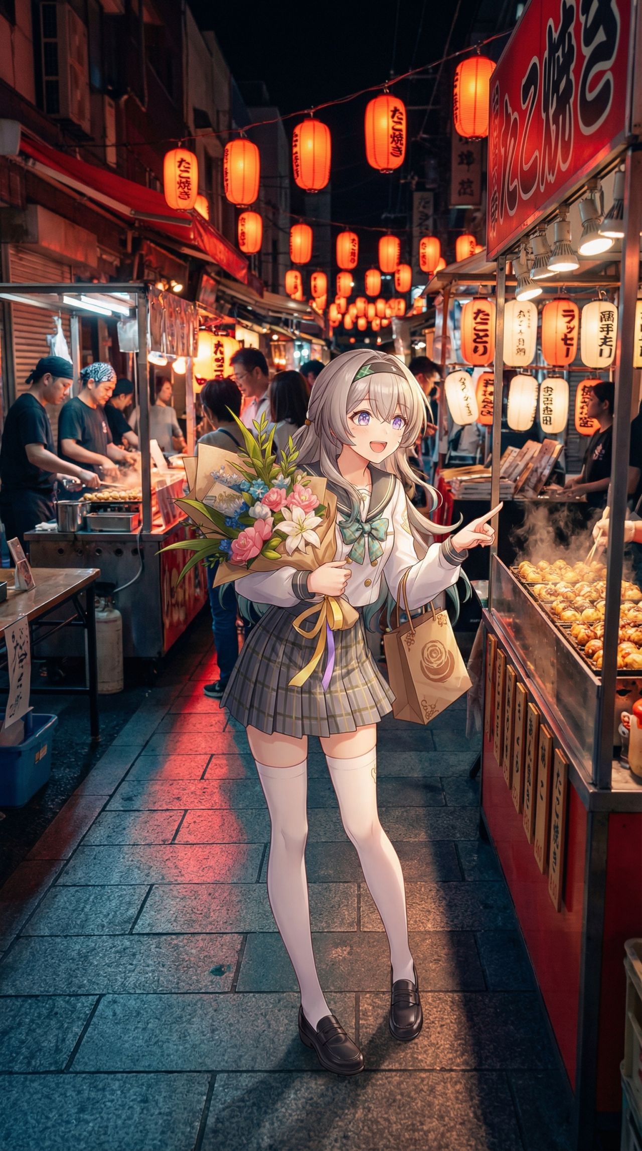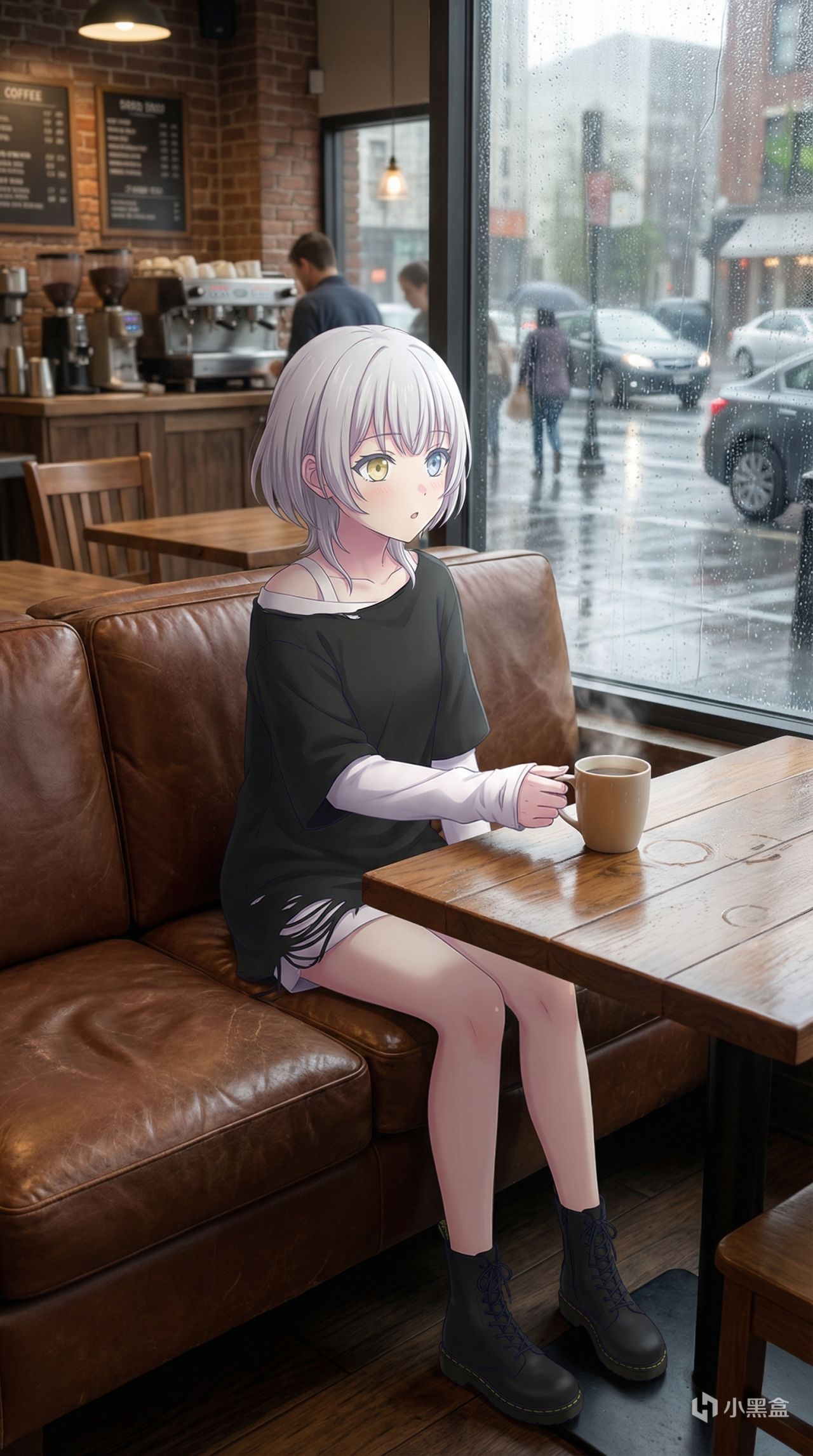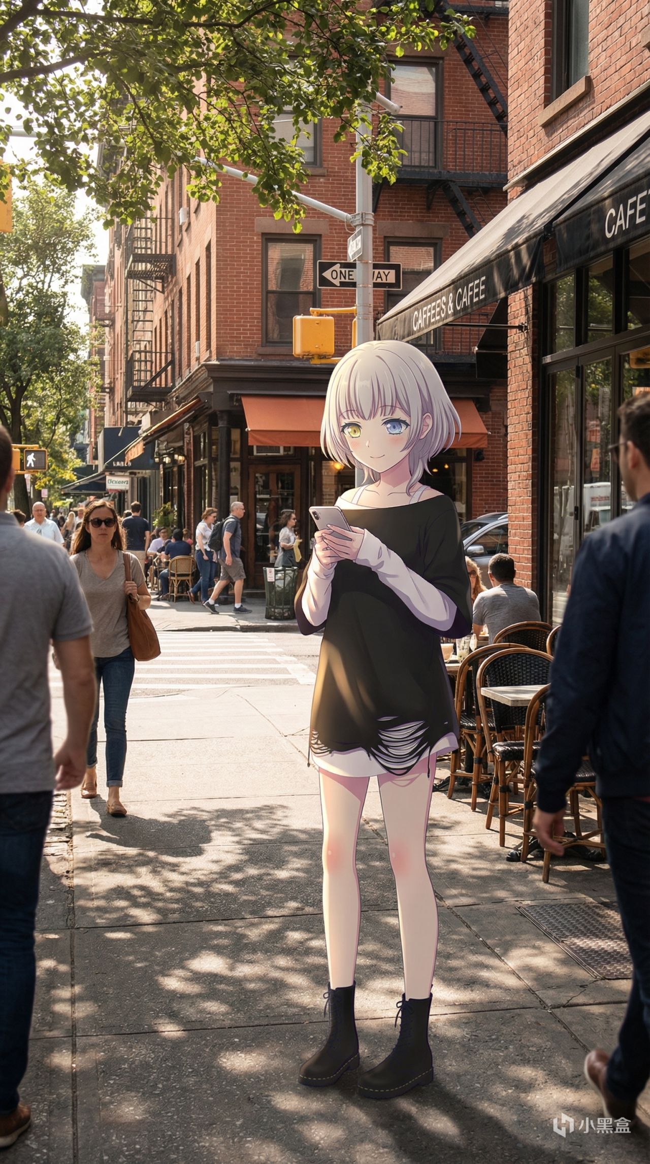 所在位置:她站在人行道一侧,靠近街角的咖啡店,身后是熙熙攘攘的人群。 可以对画面进行调色以增强表现力,确保光影效果,确认人物身高(160cm)和背景的比例,让图1中的动漫画风少女能够完美的和写实背景融合}