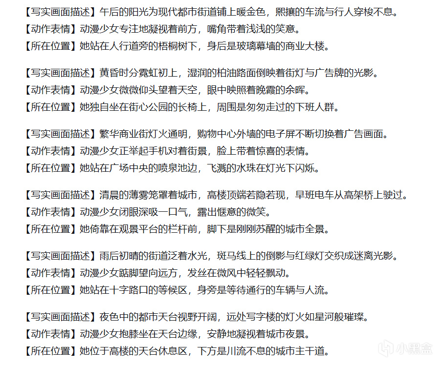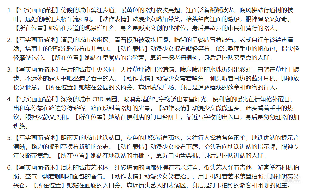 请描述动漫少女所在的写实(城市)场景,不需要服装类提示词。 输出格式: 请分行详细描述她的【写实画面描述+动作表情 + 所在位置】。每行一句话,需求六组,请直接给我中文描述。