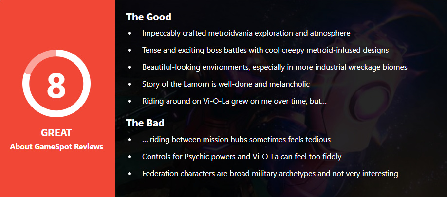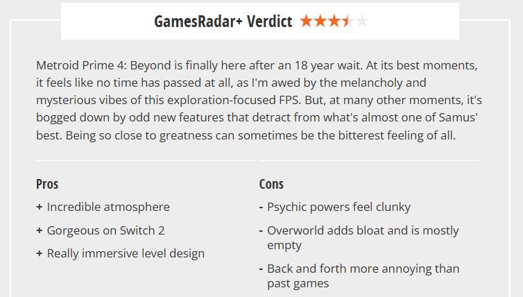 结合惊艳的艺术设计、凶悍的新头目角色与令人惊喜的星际联邦小队塑造,本作堪称系列最大胆、完成度最高的作品。毋庸置疑,漫长等待完全值得。欢迎归来,萨姆斯。