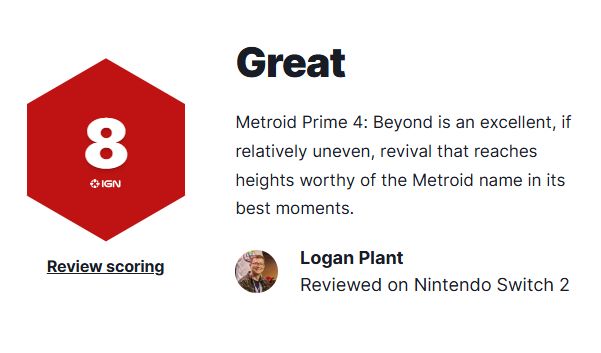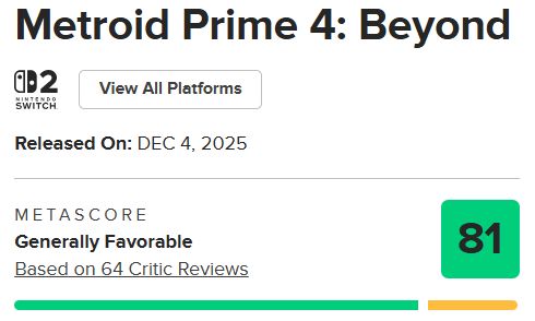 由Retro Studios重启开发、任天堂发行的第一人称探索游戏《密特罗德 究极4:穿越未知》全球媒体评分正式公布。根据Metacritic数据显示,本作目前获得80分(基于64家媒体评测)。