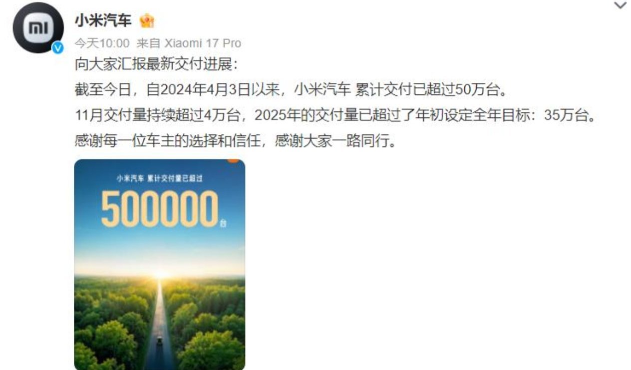 连续三个月月交付量维持在4万台以上,推动小米汽车2025年交付量已超过年初设定的35万台全年目标。这一数据比原计划提前近一个月完成。11月20日,第50万辆小米汽车已在小米汽车北京超级工厂下线。从首台车下线到第50万台,小米汽车仅用1年零7个多月(602天),刷新了全球新能源车企达成50万辆的最快纪录。小米集团创始人雷军表示,50万辆下线标志着小米汽车包括研发、制造、销售、交付和服务的完整体系能力得到了充分验证。他透露2025年全年小米汽车预计将交付超过40万台。小米汽车已进入规模化发展新阶段。其SU7车型成为过去一年20万元以上轿车销量冠军;YU7更在10月登顶国内全品类SUV销量第一。