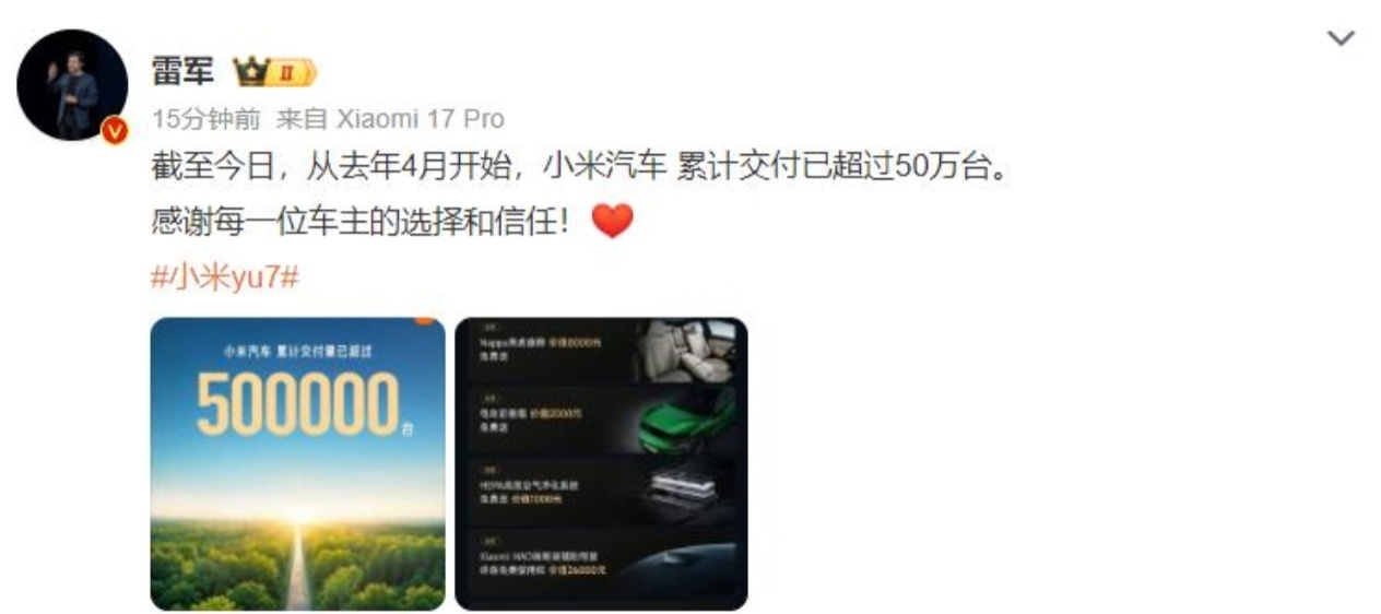 12月2日,小米汽车官方宣布,截至当日累计交付量已突破50万台大关。这是自2024年4月3日开启交付以来,小米汽车交出的成绩单。