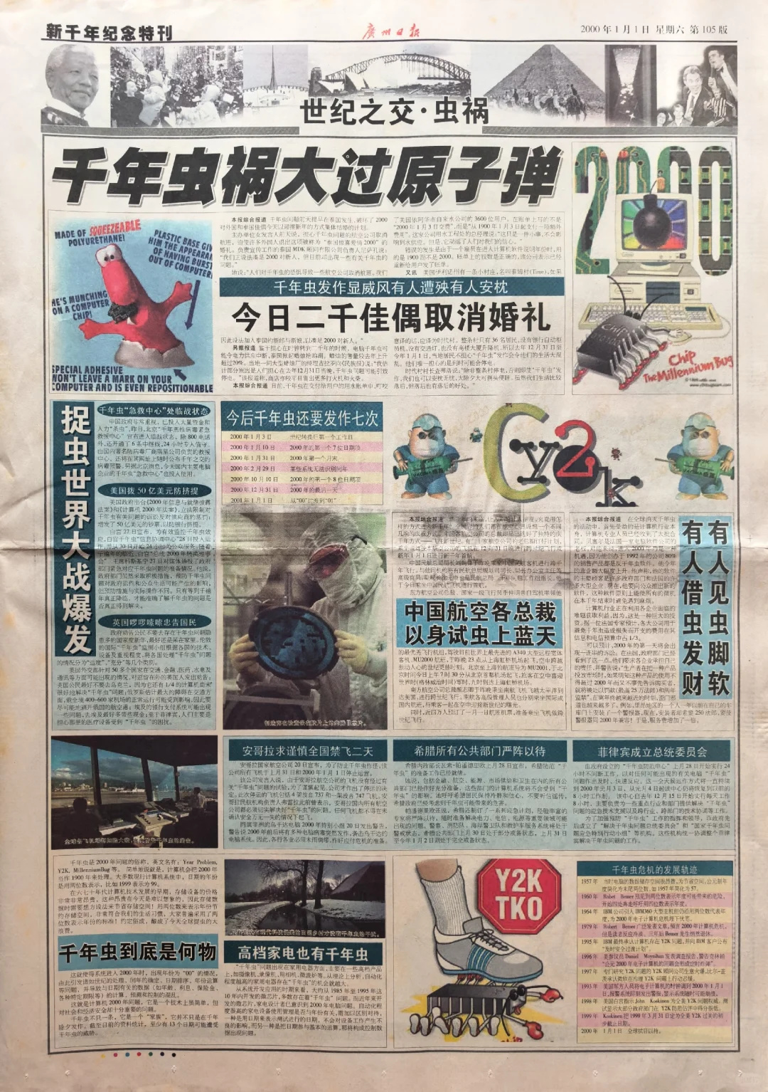 千年虫危机:早期电脑磁盘空间极其昂贵,程序员为节约内存资源,想出六位数计时法:1999年12月31日表示为991231,年份前两位则可以直接省略并默认为19。可一旦进入2000年1月1日,时间就会被识别成 000101,电脑会误认为是1900年1月1日,从而导致时间错乱,进入故障状态。