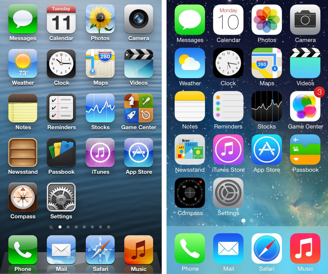 其中最具代表性的转折点,莫过于苹果系统IOS6到IOS7的转换,更简洁、扁平的图标设计取代了原本复杂的拟物化设计。