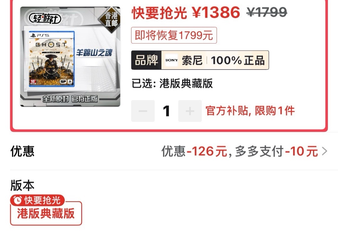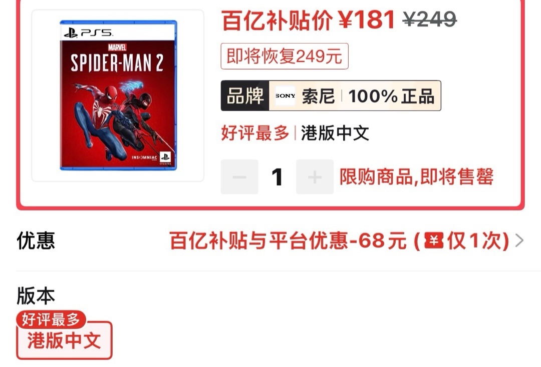 蜘蛛侠2港版常规好价181(需要30券)