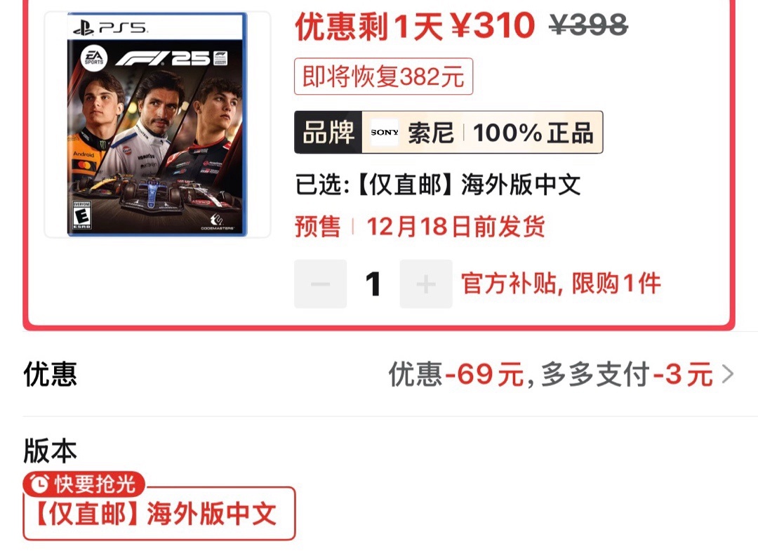 f1 25海外版出入初入百补预售310(仅85券)