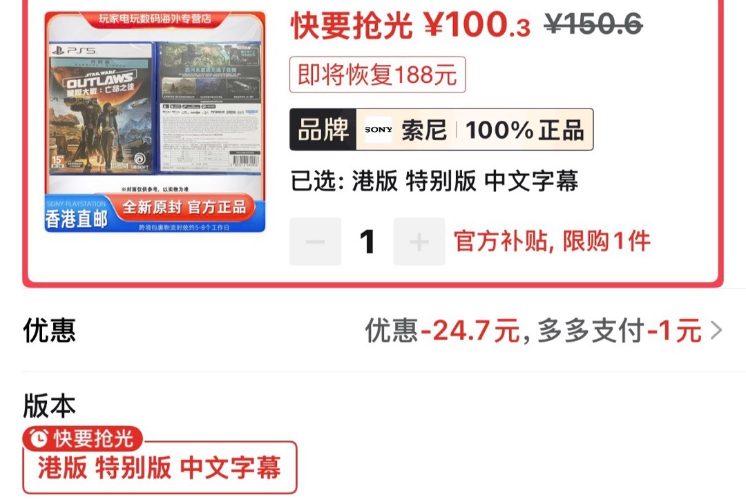 星战亡命之徒港版 特别版新史低100.3(仅85券)