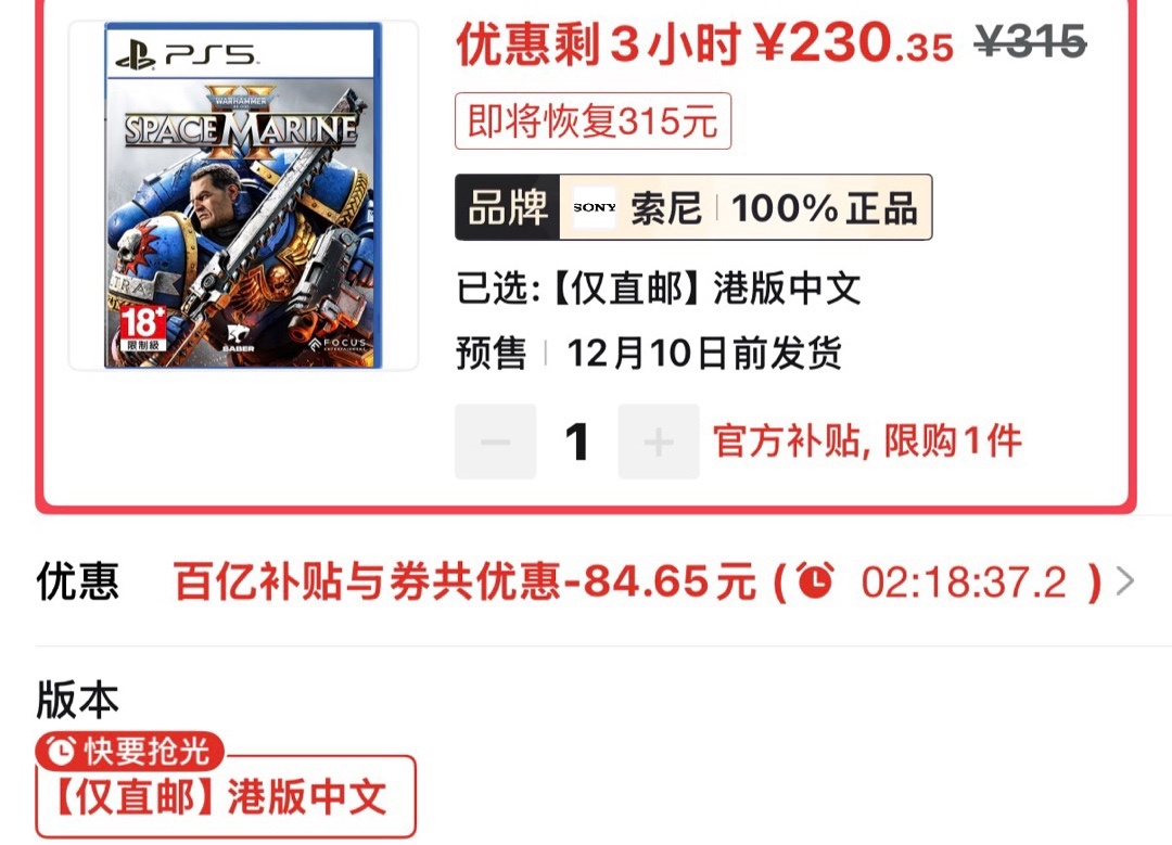 战锤星战2港版好价230.35(仅85券)