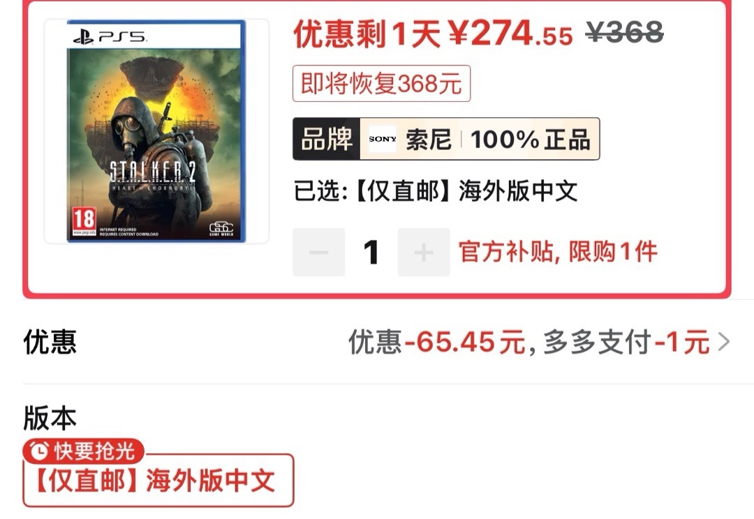 潜行者2海外版好价274(仅85券)