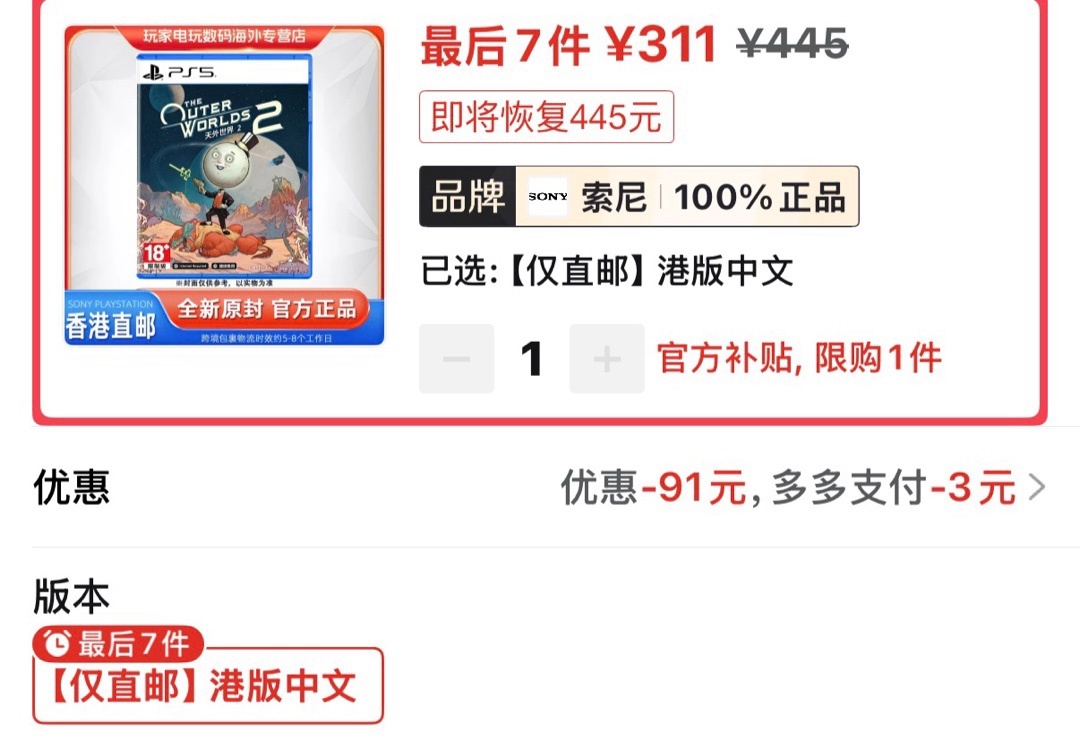 天外世界2港版新史低311(仅85券)