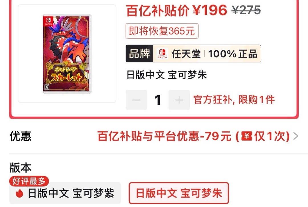 日版宝可梦朱近期好价196(需要30券)