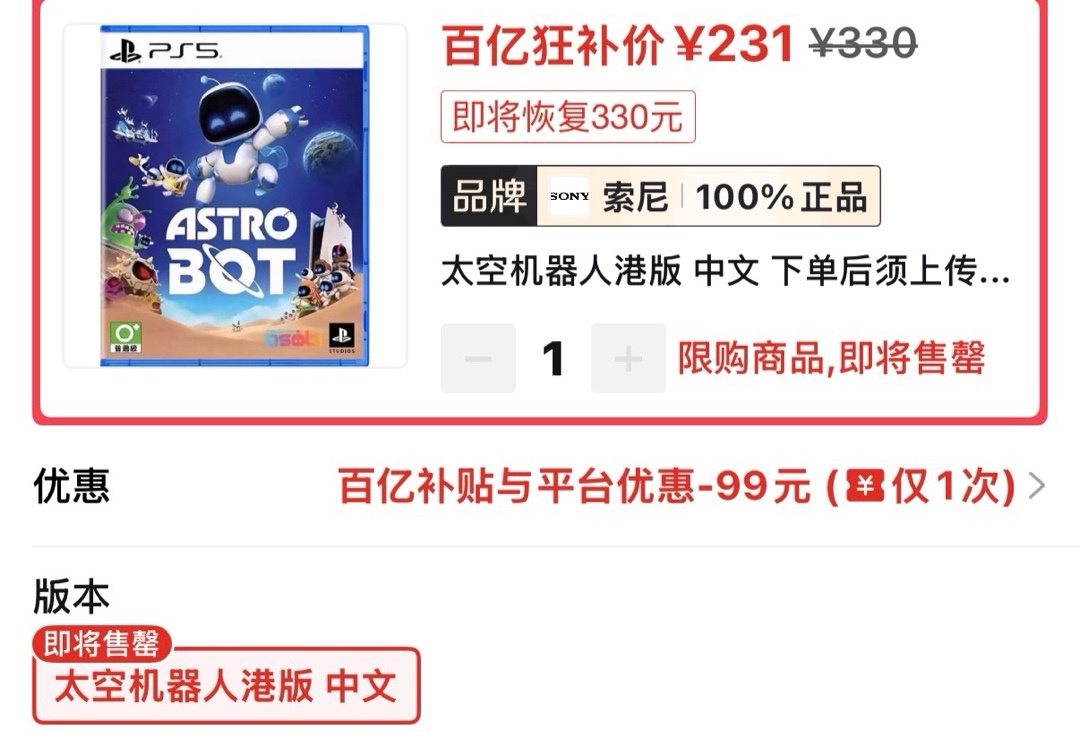 宇宙机器人港版近期好价231(需要30券)