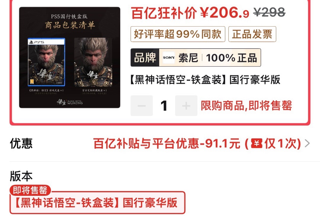 黑猴国行铁盒好价206.9(需要30券)
