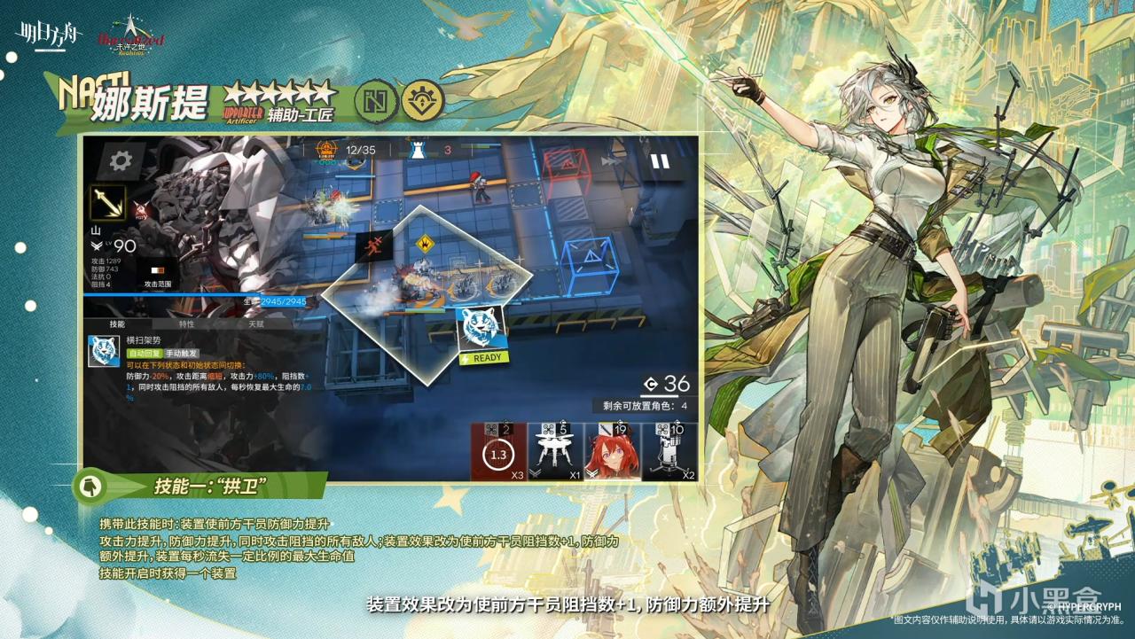 携带此技能时:装置使前方干员防御力提升 开启技能时娜斯提攻击力提升,防御力提升,同时攻击阻挡的所有敌人;装置效果改为使前方干员阻挡数+1,防御力额外提升,装置每秒流失一定比例的最大生命值,技能开启时获得一个装置。