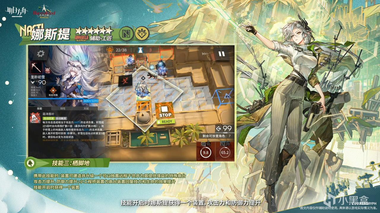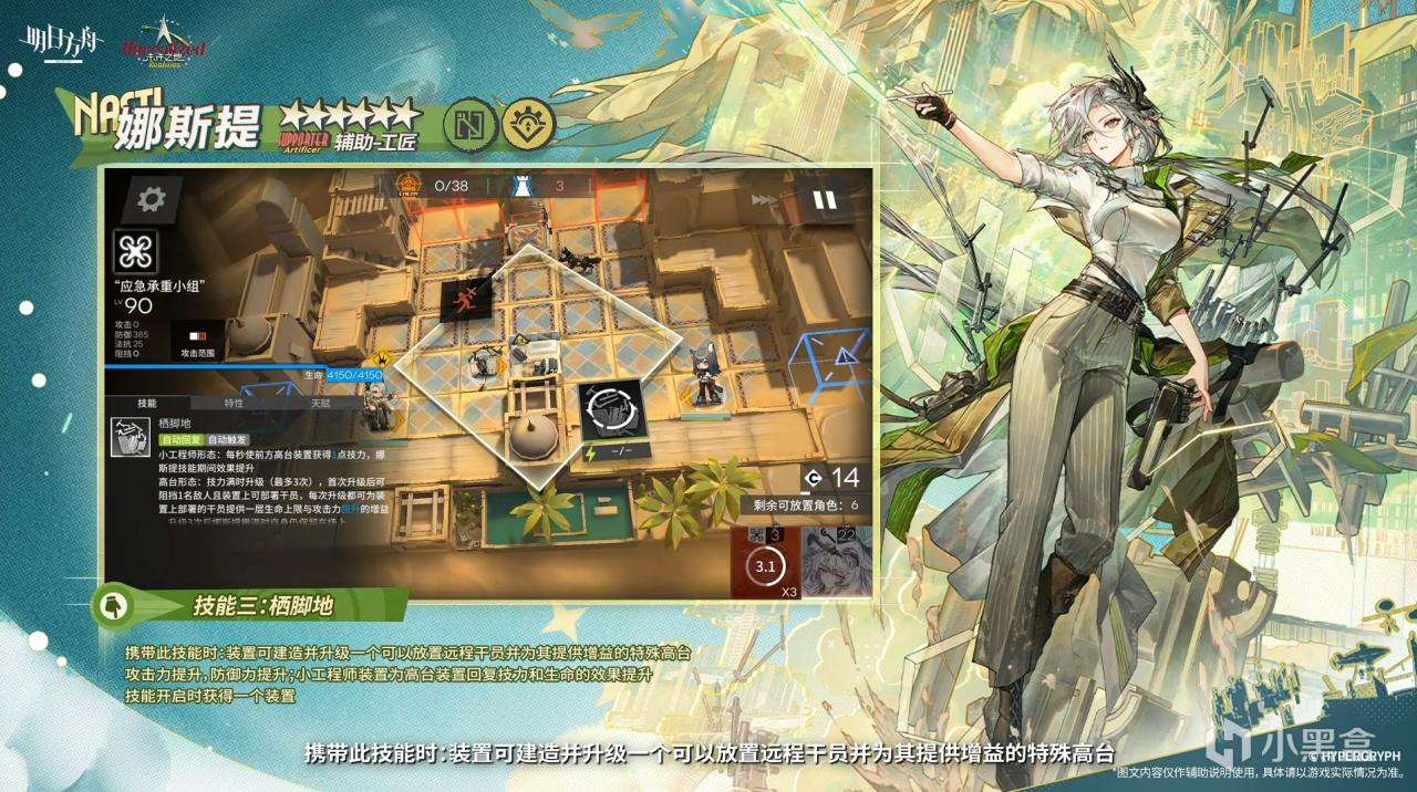 3技能装置费用3。再部署时间6秒。可以在装置前方可部署地面造高台,全场最多1个,高台有3级,3级后高台即使在娜斯提退场后也存在。高台有血量阻挡1,会被打。高台3级给干员加攻加血60%,推测每层20%。装置每秒给高台1技力并扣自己血让高台回血。推测娜斯提技能时间15秒,消耗25技力。刚好让高台升1级,如果效果是让装置给高台技力+1变成+2,那高台升级可能需要60技力还是较多的。需要开2次技能。个人推测造完3级高台大概60秒多一点,1级高台的时候放个干员上去暖机,高台3级了暖机也好了。和部分技能暖机时间接近。对于特殊地形放个初雪、EW之类的估计很好用。