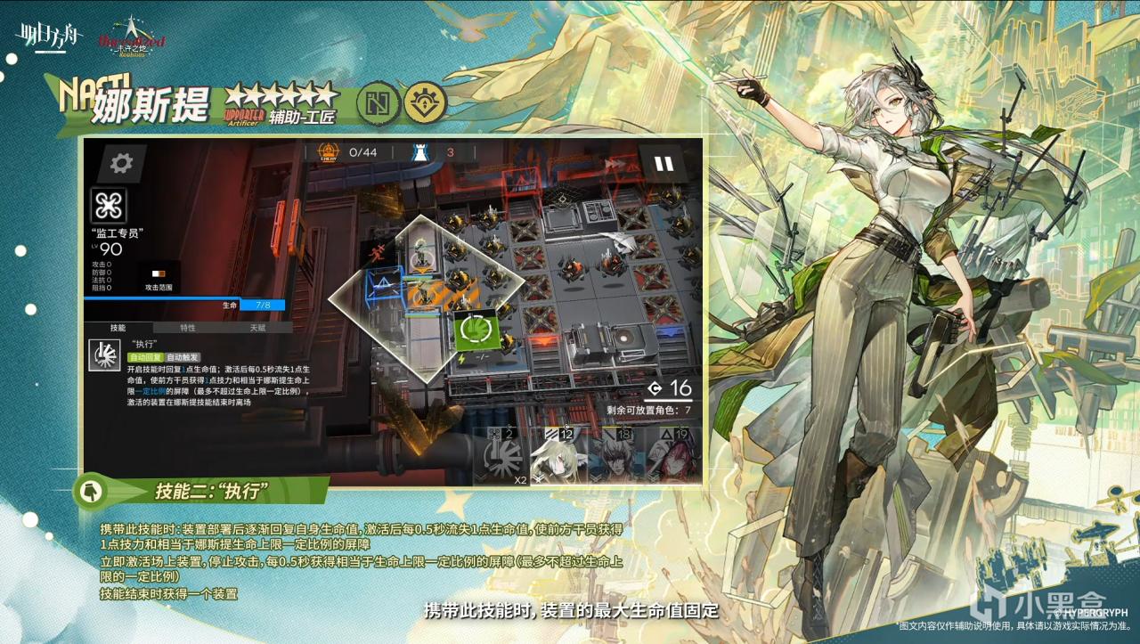 携带此技能时:装置部署后逐渐回复自身生命值,激活后不再回血,而是每0.5秒流失1点生命值,使前方干员获得1点技力和相当于娜斯提生命上限一定比例的屏障 娜斯提开技能效果:激活场上装置并回血1点,停止攻击,每0.5秒获得相当于生命上限一定比例的屏障(最多不超过生命上限的一定比例)技能结束时获得一个装置。