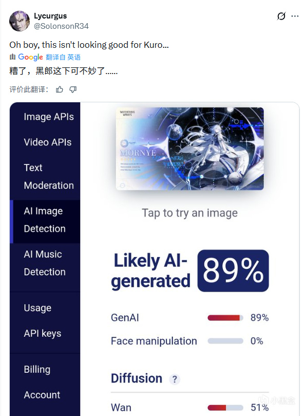 12月2日,一起恶劣的网络造谣事件在《鸣潮》(Wuthering Waves)社区引发热议。一名海外玩家将新角色「莫宁」(モーニエ)的官方立绘用AI重新生成,故意制造瑕疵后上传至AI检测网站,得到“89%疑似AI生成”的结果,并配文暗示开发商库洛游戏(KURO GAMES)使用AI绘图,借此进行攻击。