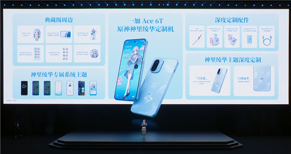核心配置方面,一加Ace 6T原神神里绫华定制机采用6.83英寸1.5K高刷屏,搭载高通第五代骁龙8芯片,内置8300mAh电池,支持100W有线快充。