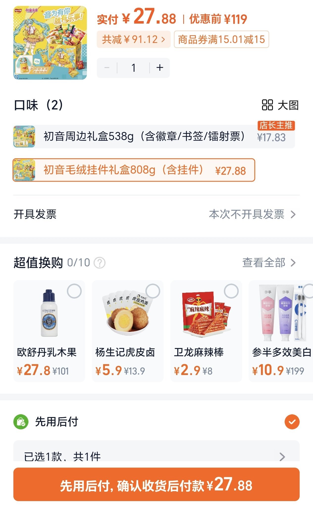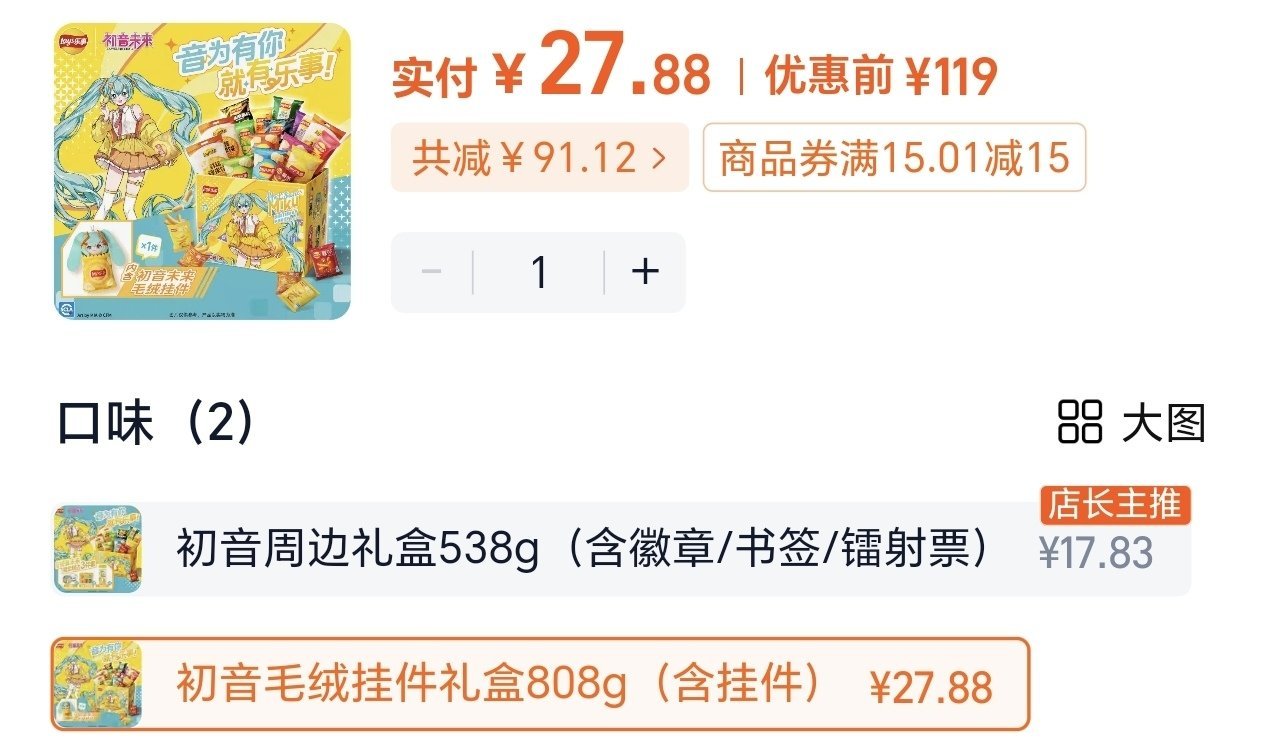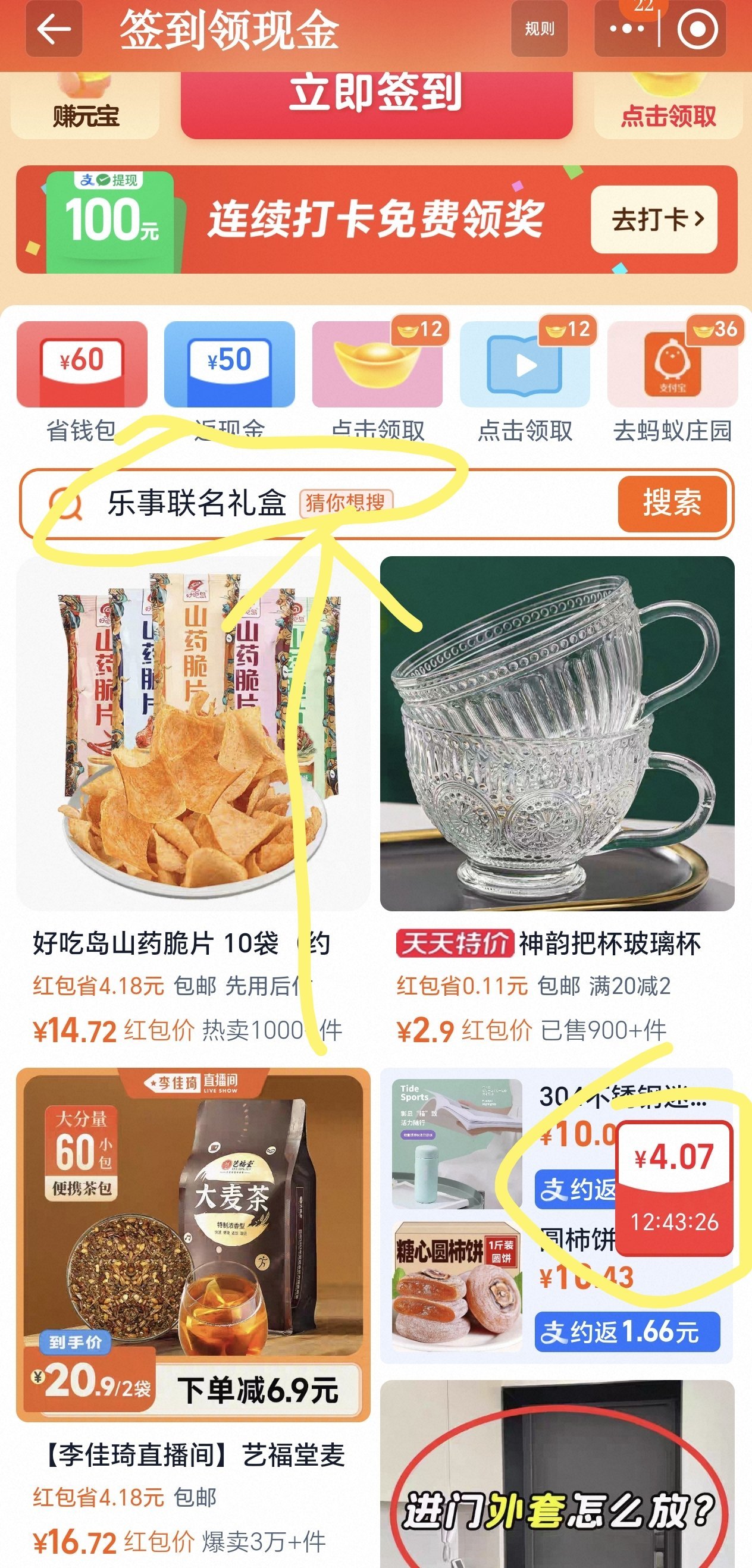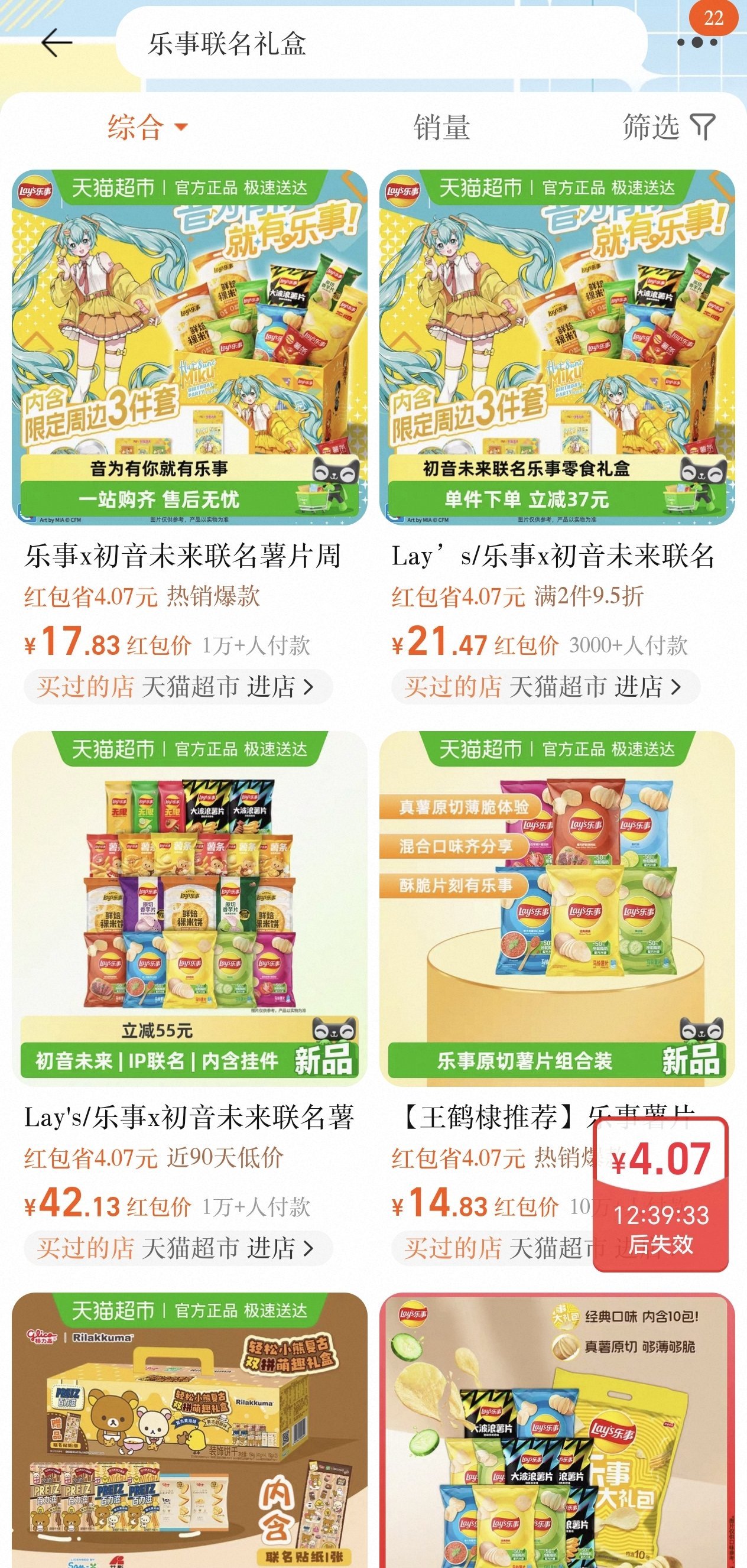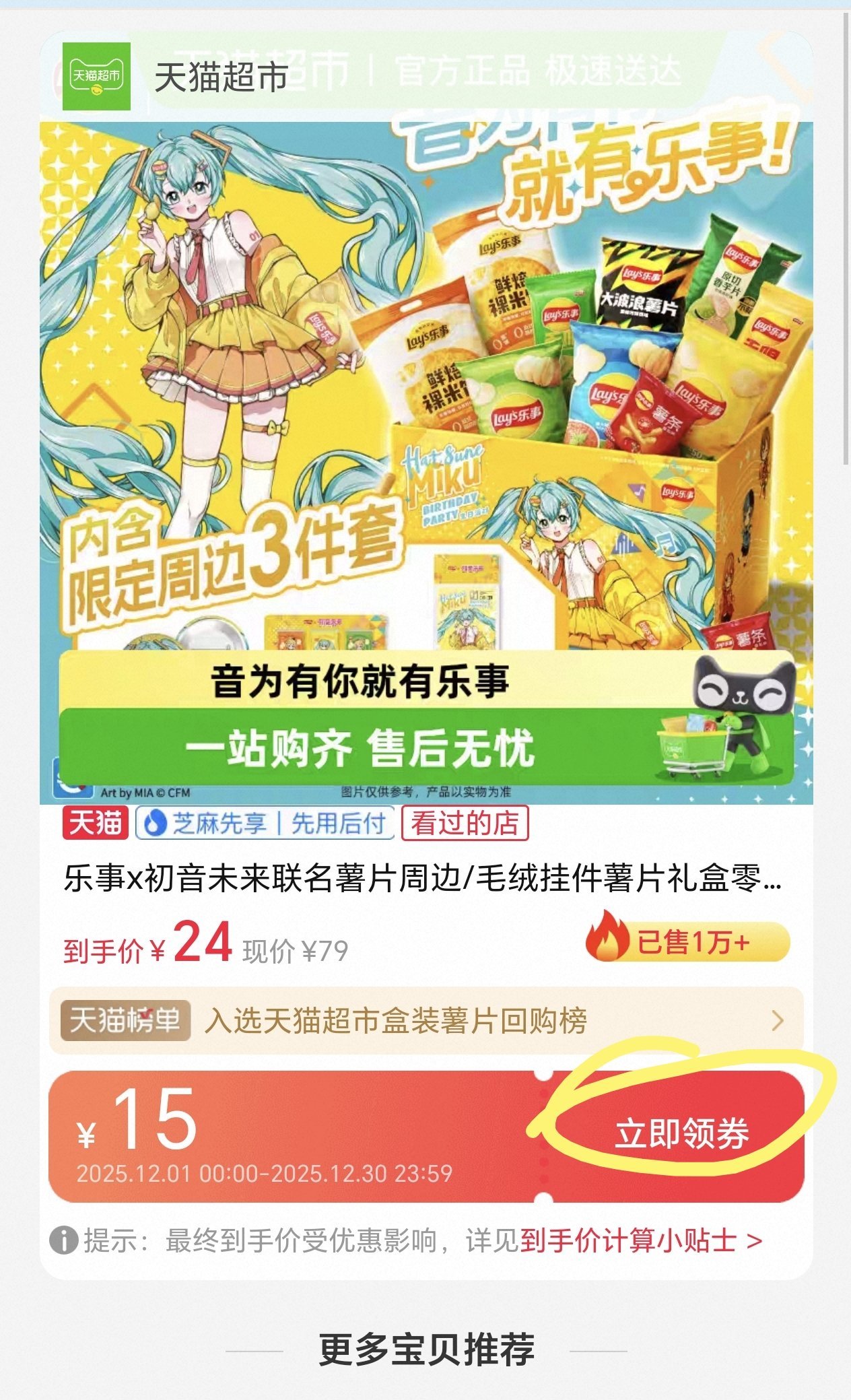 第二步,淘宝首页-红包签到(会给红包🧧)-红包签到界面🔍“乐事联名礼盒”-找到初音联名的购买即可!
