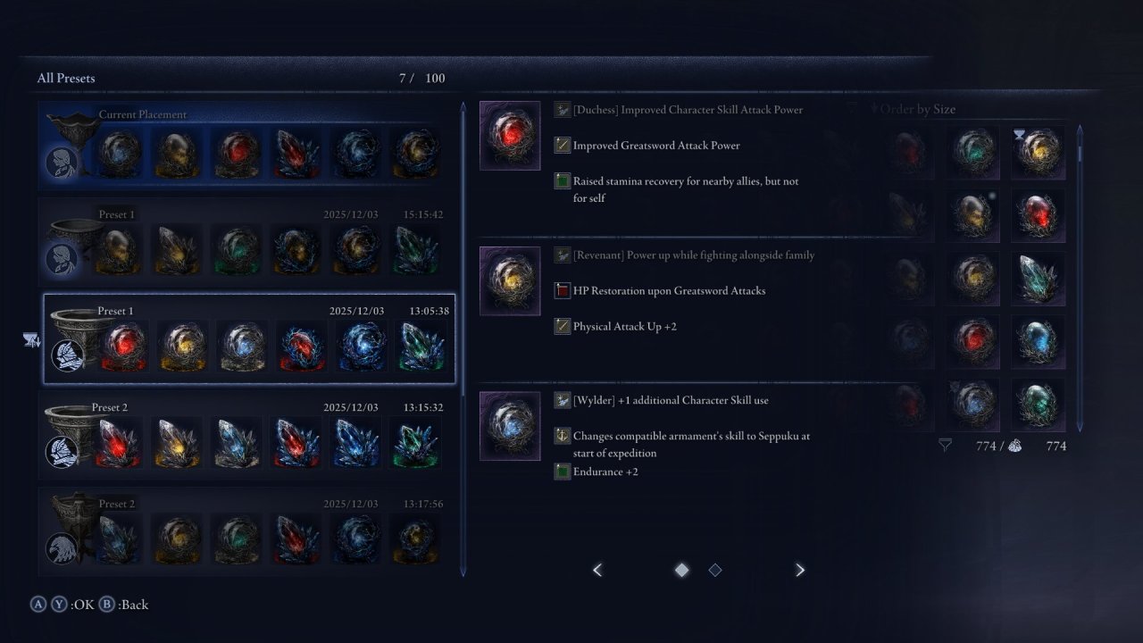 现在可在遗物仪式菜单的“全部预设”界面,调整各角色的预设顺序